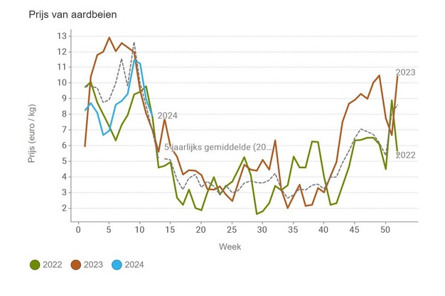 Last week, the cucumber price soared above the five-year average after weeks of slender prices. The tomato price aligns with that five-year average, while the strawberry price has commenced a nosedive. However, in comparison to previous years, this trend for strawberries is not unusual. This is evident from a summary of median prices at auctions affiliated with the Union of Belgian Horticultural Cooperatives. As production picks up, leading to gradually more volume on the market, the strawberry price is descending from great heights.