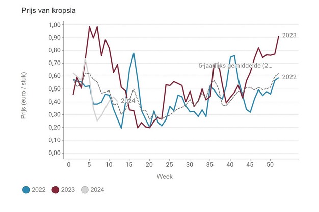 For lettuce, the price is now also above the five-year average. The price movement is quite similar to cucumber, although the price increase here has been steadily ongoing for longer.