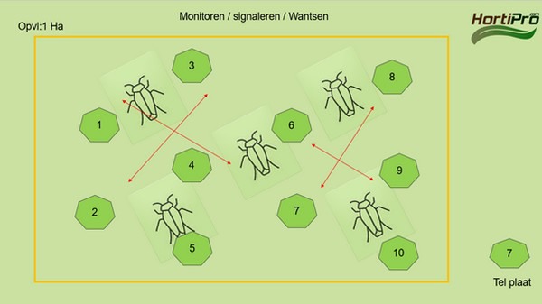 He is currently tracking the population development of Nesidiocoris tenuis. To signal effectively, HortiPro advises an even distribution of 10 pheromones per hectare. "What we sometimes encounter in practice is a false economy, where the pheromones are only hung in a corner of the greenhouse where the grower expects the pest. If Nesi then appears elsewhere, there's a risk of being too late, resulting in crop damage."