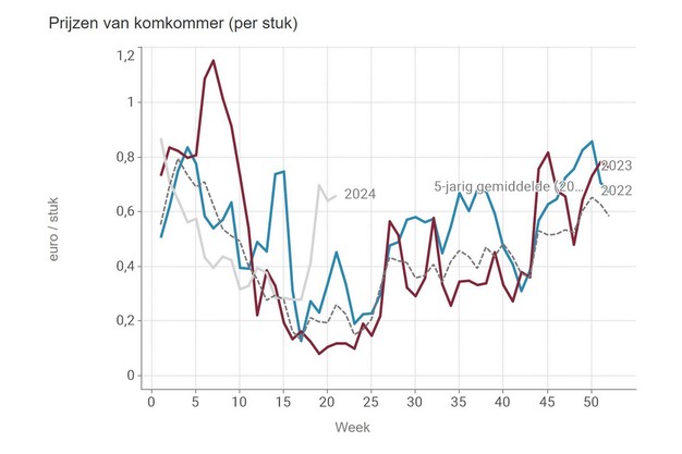 The already high cucumber price on the VBT clocks has risen slightly again in week 21, resulting in an average price of just over 66 euro cents per piece. That's more than twice the 'normal' amount. Tomato prices are currently in line with the 'normal', the five-year average, and are around 50 euro cents per kilo.