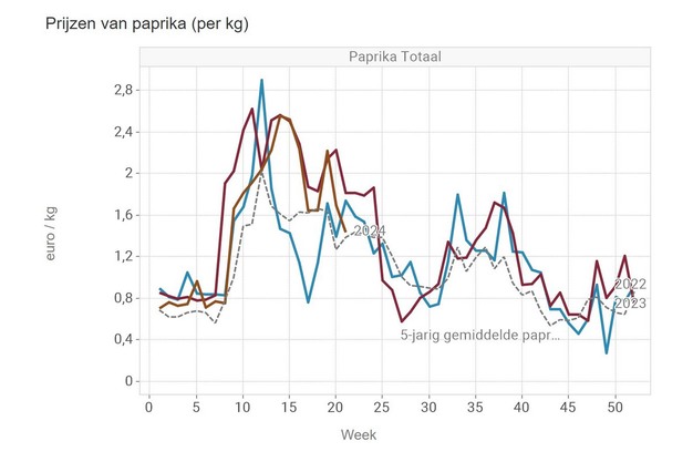 Bell pepper prices fell last week to just above that five-year average, when lumping all colors together. The price for green went up slightly to 1.33 euros. Yellow and especially red saw a decrease in price, with yellow at 1.20 and red at 1.57 euros rounded as kilo prices.