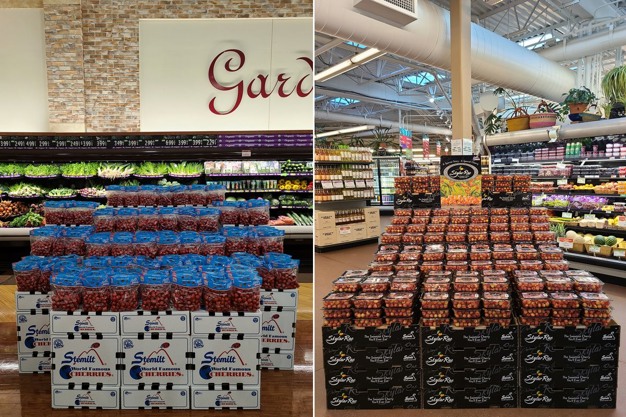 Merchandising berries and mangos.
