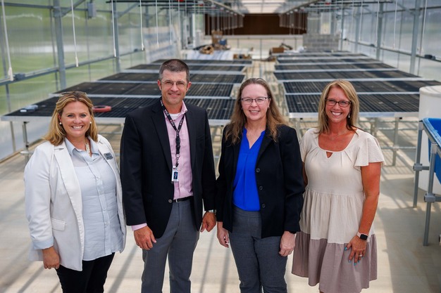 (Left to right) Scott County Schools Assistant Superintendent of Student Learning Stephanie Emmons, Scott County Schools Superintendent William Parker, Senior Associate Dean for Instruction in the UK Martin-Gatton College of Agriculture, Food and Environment Carmen Agouridis, and Scott County High School Principal Elizabeth Gabehart stand in the new SCHS greenhouse. Photo by Matt Barton