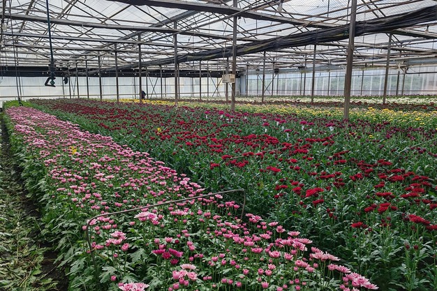 "Our Chrysanthemums cover the biggest area and are also accommodated in heated greenhouses with screens. This crop can be manipulated and production steered in an almost perfect way. It makes it thus very popular with growers that target special events like Christmas. A period of 12 days is required for rooting, followed by a vegetative stage 'long day' stage of anything between 12 to 22 days. Once the plant goes into the 'short day' stage, it slowly turns towards reproductive, flowering 45 to 60 days later."