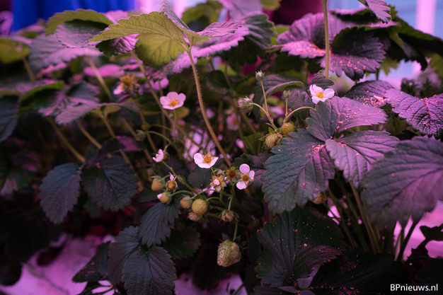 In one of World Horti Center's greenhouses, four students from the Horti Technics & Management course are busy growing young strawberry plants. The LED lighting is turning the greenhouse 'pink', the plants are getting fruit and there are bumblebees are flying around.