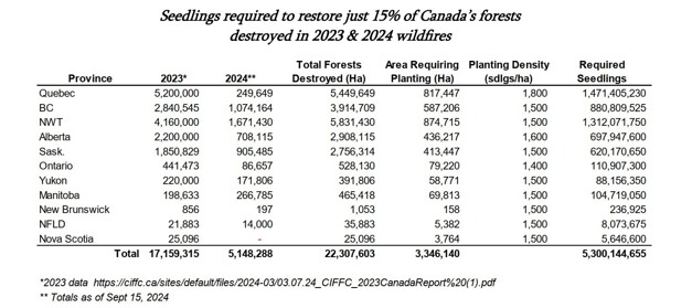 The Canadian Tree Nursery Association-Association Canadienne des Pépinières Forestières (CTNA-ACPF) advocates on behalf of 60 tree nurseries (CTNA-ACPF Membership) from coast to coast to coast. Formed in 2023, the CTNA-ACPF is the national voice representing tree nurseries in Canada, with their members growing more than 95% of the nation's forest restoration tree seedlings. The data they presented, shows the number of seedlings required by jurisdiction to start mitigating the impacts of 2023 and 2024 wildfires: