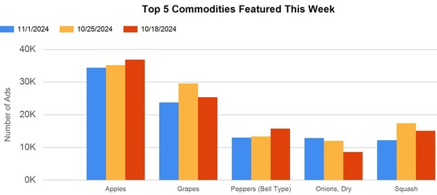 Total ad numbers this week were 280,786, a 7% decrease from last week's total of 301,737. The total for the same week last year was 2% higher at 285,800. The total number of ads broken out by commodity groups: fruit 146,515 (52% of all ads), onions and potatoes 24,474 (9%), vegetables 103,237 (37%), herbs 2,290, ornamentals 4,233, and hemp 2,327. The number of ads for organic produce was 32,940, 12% of total ads.