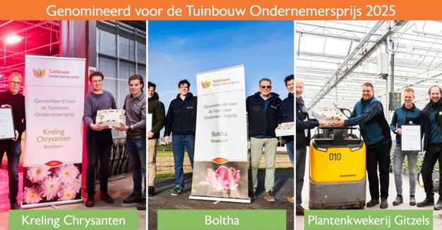 Last month, the nominees for the Dutch 2025 Horticultural Business Award (Tuinbouw Ondernemersprijs) were revealed. Chairman Peter Maes made surprise visits to Plantenkwekerij Gitzels and Boltha Flower Bulb Nursery to personally congratulate the contenders. He also extended his congratulations to Kreling Chrysanten. Meanwhile, Jeroen Noot, the independent jury chairman for the Future-proof Technologies Theme Prize, visited the shortlisted candidates: CE-Line Internationaal, ISO Horti Innovators, and Valto Biocontrol.