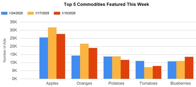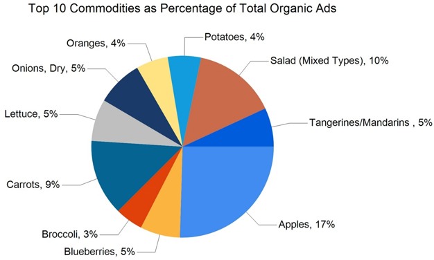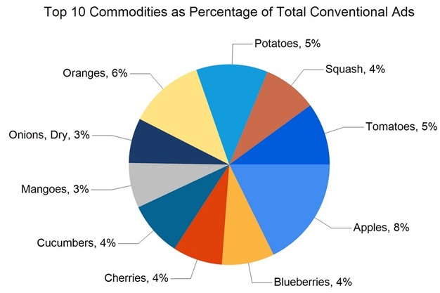 Total ad numbers this week were 268,583, a 3% decrease from last week's total of 275,851. The total for the same week last year was 2% higher at 273,786. The total number of ads broken out by commodity groups: fruit 134,412 (52%), onions and potatoes 23,669 (9%), vegetables 101,823 (38%), herbs 547, ornamentals 1,456, and hemp 2,223. The number of ads for organic produce was 41,124, 15% of total ads.