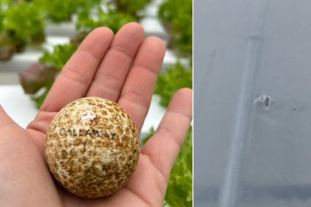 It was an early morning at Salad Days Produce in Flora, MS, and the greenhouse was humming with the sound of clippers snipping through rows of fresh lettuce. The harvest crew settled into their routine when—BAM!—a loud, unexpected bang echoed through the air, rattling the quiet morning. The startled crew looked up. Investigation learned that a golf ball crashed into the greenhouse roof at a velocity that's enough to puncture the top layer of plastic, landing with precision in the gutter between two houses. Now the company wonders what happened.