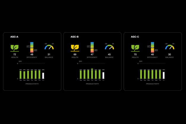 The Gardin Pulse dashboard with four Key Plant Indicators: Health, Efficiency, Balance, Productivity. Team MuGrow's control algorithm aimed to control the greenhouse to achieve optimal set points for each indicator.