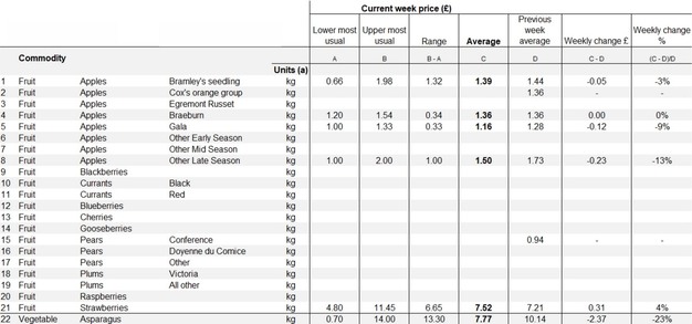 In contrast, the price of strawberries has shown an upward trend. The average price of strawberries increased from £7.21 per kilogram in the previous week to £7.52 in the current week, reflecting a rise of £0.31, or 4%. This increase highlights a positive price adjustment in the strawberry market, contrasting with the downward trend observed in certain apple varieties.