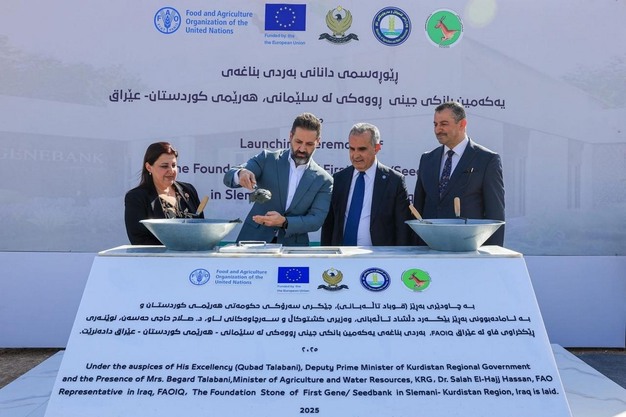 Under the auspices of H.E. Mr. Qubad Talabani, Deputy Prime Minister of the Kurdistan Regional Government, Iraq marked a major step toward safeguarding its agricultural heritage and enhancing its food security with the laying of the foundation stone for the first-ever Gene/Seed Bank in the Region. The facility, located in Hawari Shar Park in Sulaymaniyah, is funded by the European Union (EU) and implemented by the Food and Agriculture Organization of the United Nations (FAO), in collaboration with the Federal and Regional Governments as part of the "Restoration and Strengthening the Resilience of Agri-Food Systems in Iraq" project. The facility will enable the preservation of plant genetic diversity, enhance food security, and build resilience against climate change.