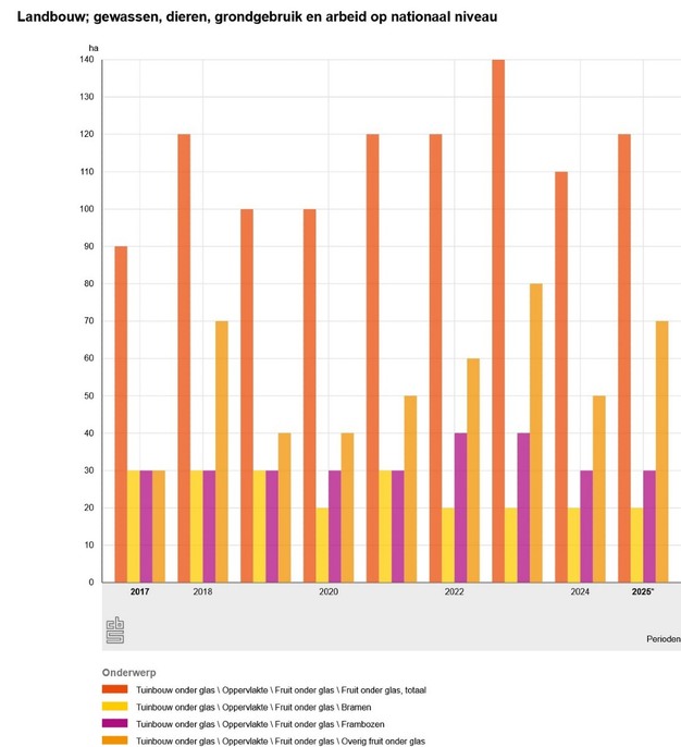 After a dip in 2024, the total area of fruit grown under glass in the Netherlands has seen a slight increase, according to preliminary figures from Statistics Netherlands (CBS). The current area stands at 120 hectares, reversing a trend of steady decline in recent years. The number of growers involved in greenhouse fruit production is 94, although strawberries are not included in these figures.