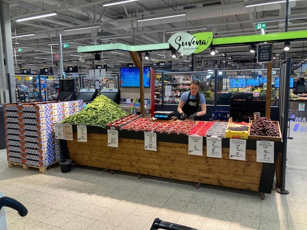 Sales at Suvena, Finnish for "summertime," take place largely via a shop-in-shop concept, which is unknown in the Netherlands and rarely seen in Europe. It originated from Finland's short, hectic open-field strawberry season and the country's long travel distances. "Strawberries grown in Finland, with their high brix levels, are very sweet but also fragile. In the past, their quality was so soft that if picked on Monday, they had to be sold on Tuesday. That doesn't work with a large chain using central procurement and distribution centres in a country the size of Finland. That's why there are always small local companies that sell soft fruit in and around supermarkets in season, for a commission or a stall fee. The advantage for the supermarket is that they don't need to manage anything, and the shelf always looks good."