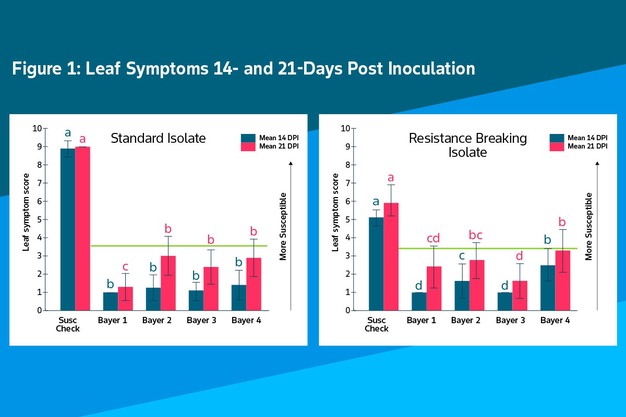 © Vegetables by BayerIn each trial, 20 data points were collected for each variety. To assess the statistical significance of the symptom differences between varieties on each evaluation date, a Tukey test was employed. According to the test results, varieties that share the same letter cannot be differentiated in terms of symptom severity, whereas those with different letters exhibit distinct levels of symptom severity. The findings revealed that all Bayer varieties demonstrated significantly greater resistance compared to the susceptible check in both the St-ToBRFV and RB-ToBRFV trials at 14 and 21 days post-inoculation.