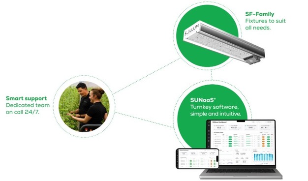 Zone-by-zone control is enabled with Sollum's advanced dynamic solution, which combines three elements to simplify operations. The system uses smart fixtures with dynamic LEDs that provide per-channel control to fine-tune the full spectrum. It is paired with SUN as a Service®, an AI-based cloud platform that automates schedules, adjusts output according to ambient light, and stores recipes tailored to crops, growth stages, and regions. In addition, the 360 Support service ensures continuous monitoring of the LED lighting platform and notifies Sollum of any changes in the system. Agronomic and technical experts are also available by phone, email, or on site, from planning through harvest.