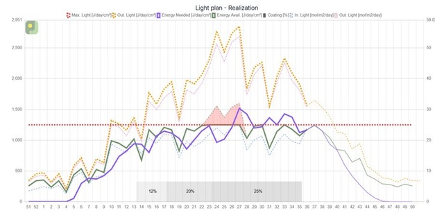 © ProJoulesWim notes that more and more growers are starting to use PAR meters, and with that, the number of ProJoules users continues to grow. As a result, more growers are becoming familiar with the so-called "red cloud." For newcomers, and even for experienced users, Wim offers one piece of advice: don't try to eliminate the entire red cloud. Leave a little margin. That way, during the season, you still have flexibility to apply extra coating or shading when it's really needed. ProJoules helps growers pinpoint exactly the right moment to do so.