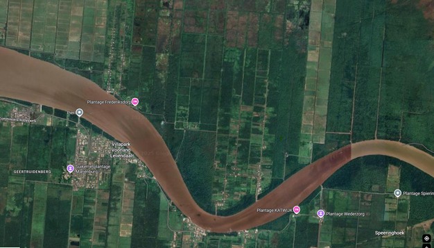 © Google MapsAlong the Commewijne River, the former structure of plantations next to the water is clearly visible.