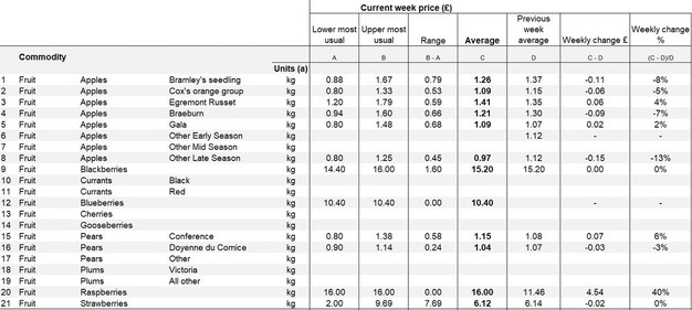 Raspberries showed the strongest movement in the report, rising from £11.46 to £16.00, an increase of 40 per cent. Strawberries averaged £6.12, slightly below the previous £6.14. Blackberries held steady at £15.20, unchanged week-on-week.