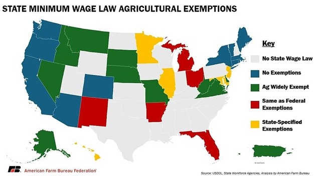 Currently, 21 states have minimum wage laws that apply to agricultural workers. State wage levels range from US$8 to US$17.13 per hour, up to 136% above the federal requirement. These state policies contribute to a patchwork of wage rules that differ not only between states but also within individual states, where separate rates exist for metro areas or specific worker categories.