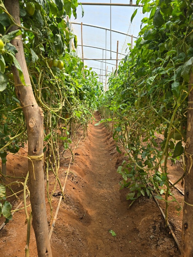 Tomatoes have two planting cycles per greenhouse per year, each lasting approximately six months. Other greenhouse crops, including cucumbers, sweet peppers, and cherry tomatoes, follow a staggered schedule across the 24 units, allowing year-round production. Open-field crops are grown seasonally, with yields dependent on rainfall, disease pressure, and occasional hail events.