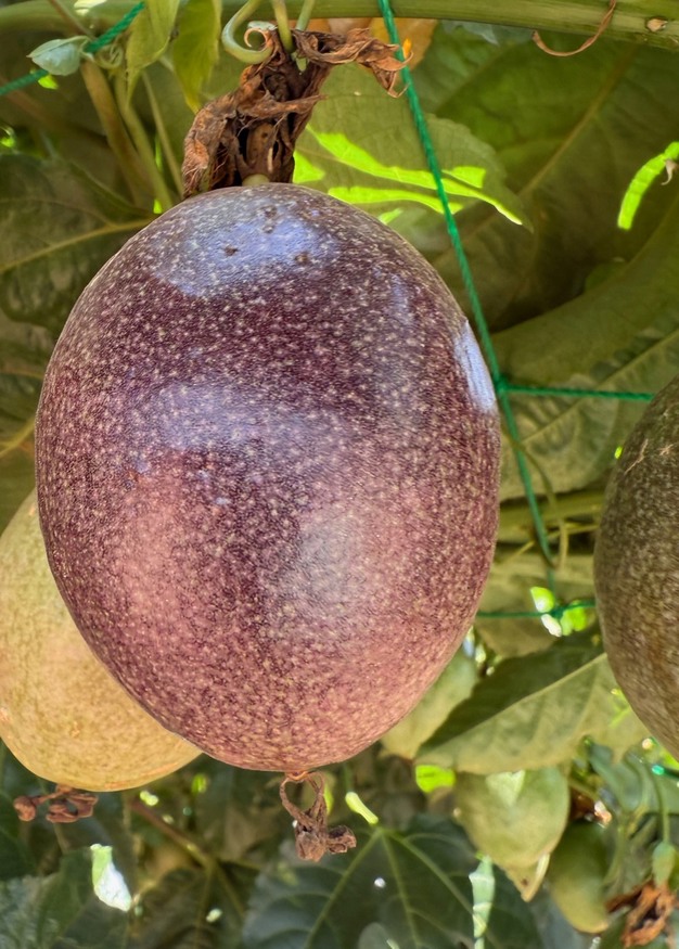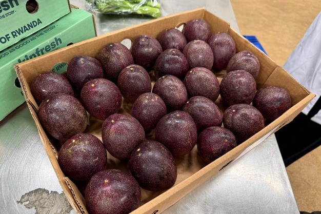 Kinvest currently exports passion fruit, bird's eye chili, and French beans, with Hass avocados and coffee on the horizon. Their star crop is the purple-skinned, yellow-fleshed Ester passion fruit variety imported from South Africa. It's high-yielding, up to 20 tons per hectare, and can be harvested almost year-round thanks to drip irrigation. "It has returns within nine months after planting, so that was a good crop for us to start with," explains Jesse.