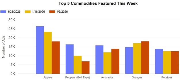 Overall, retail data for the week reflected higher ad volumes and selective price movement across produce categories, with vegetables and certain fruits remaining central to consumer purchasing patterns during the colder period.