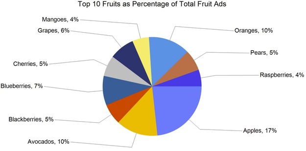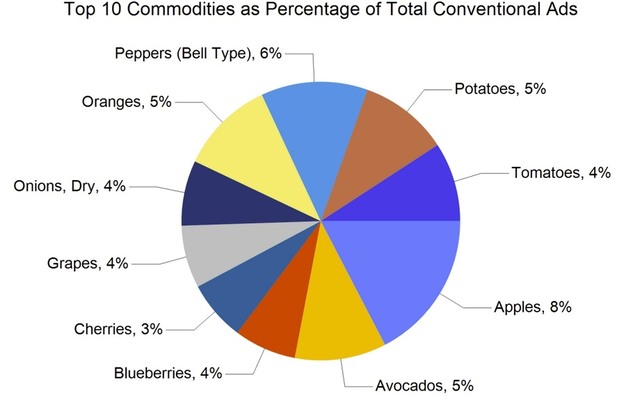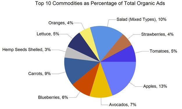 Total retail advertisement placements reached 291,957, up 5% from last week's 276,958. Compared with the same week last year, ad volume was 9% higher, when totals stood at 268,583. By commodity group, fruit accounted for 155,994 ads, representing 53% of the total. Vegetables followed with 106,199 ads, or 36%, while onions and potatoes totaled 23,470 ads, or 8%. Other categories included herbs with 1,319 ads, ornamentals with 2,076, hemp with 2,539, and honey with 1,679. Organic produce accounted for 41,591 ads, representing 14% of all listings.