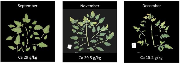 © SignifyTomato leaves in September, November and December. Each leaf is the 8th leaf counted from the top of the plant. Despite steady water uptake, the calcium fails to reach the plant head.