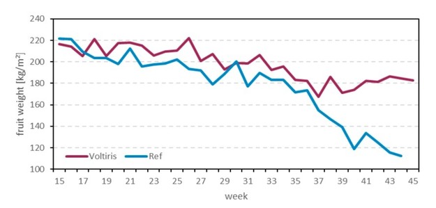 In the reference compartment, challenges with plant health emerged during the final months of the crop cycle. The high plant load earlier in the season may have negatively affected crop vitality in this compartment. As plant health declined, average fruit weight decreased and harvesting ended two weeks earlier than in the compartment with Voltiris panels. Over the full trial period, 13% of the fruits in the reference were rejected due to insufficient weight, compared with only 5% under the Voltiris modules.