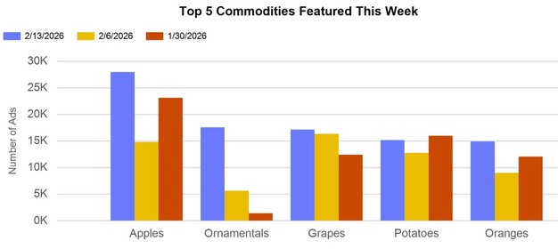Retail activity this week focused on seasonal fruit, vegetables, and floral items, with Valentine's Day influencing assortment and display emphasis. Raspberries, strawberries, asparagus, and grapes were widely featured. In floral categories, roses and tulips accounted for the majority of advertisements, while spring bulbs, gladiolas, and chrysanthemums also contributed to a higher volume of ornamental listings. Avocado advertisements declined following elevated activity linked to the Super Bowl. Chinese New Year promotions supported increased visibility for pomegranates and persimmons. Mardi Gras-related advertising included onions, green bell peppers, celery, and King Cakes.