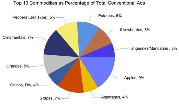 Onions and potatoes represented 24,649 ads, or 8 per cent. Vegetables totalled 94,725 ads, or 32 per cent. Herbs recorded 1,089 ads. Ornamentals accounted for 17,626 ads, or 6 per cent. Hemp totalled 198 ads, and honey 2,133 ads. Organic produce was featured in 34,545 ads, representing 12 per cent of the overall total.