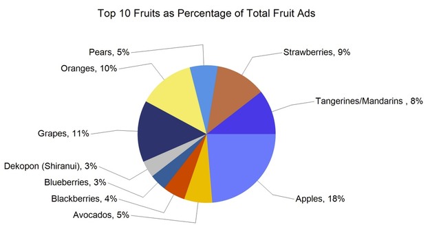 Total ad numbers reached 295,799, representing a 6 per cent increase compared to last week's total of 279,167. The total for the same week last year was 286,859, 3 per cent lower than the current level. By commodity group, fruit accounted for 156,468 ads, or 53 per cent of the total.
