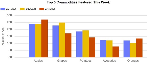 Retailers assisted shoppers at the checkout this week with promotions on produce favourites. Grapes were the most-advertised fruit, followed by strawberries and blackberries. Russet potatoes, cucumbers, and mushrooms were among the most frequently promoted vegetables. Imported fruits such as peaches, nectarines, plums, mangos, and pineapples are featured in produce aisles.