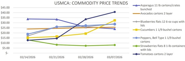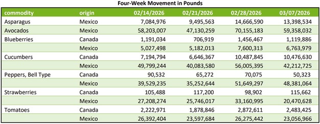 Shipments from Mexico through Texas are expected to decline slightly. Supplies are light, and prices dropped sharply. Vine-ripened cartons are mostly US$26.95-28.95 for 4x4-4x5 sizes and US$24.95-26.95 for 5x5-5x6 sizes. Shipments through Nogales, Arizona, increased slightly but also recorded lower prices.