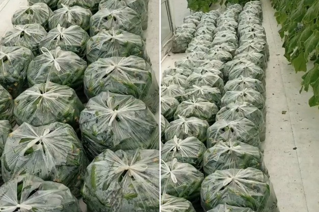 Treated and recovered cocopeat bags on the right; harvest that followed on the left