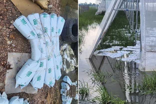 Flood damage to cocopeat bags and greenhouse