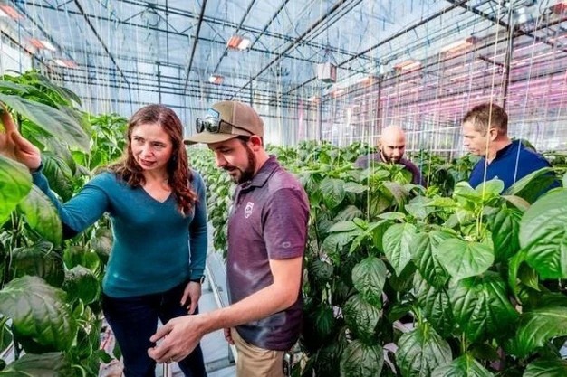 © Signify Netherlands B.V.Pepper trial team members examine the pepper crop in UBC greenhouse. Melina Biron, University of British Columbia, John Galbraith, Signify, Amos Bassi, Signify, Dustin Mater, Svensson.