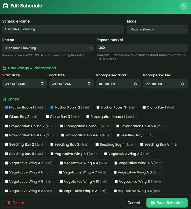 Netvion tracks PPFD continuously across every zone and adjusts supplemental output automatically to keep each zone on its daily target. When natural light falls short, the system compensates by precisely the required amount. When natural light is stronger than expected, it pulls supplemental output back — avoiding unnecessary energy spend.