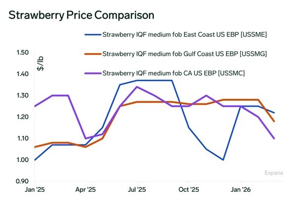 In Florida, winter freeze events reduced yields. Supply recovery has coincided with increased volumes from Mexico and the start of the California season, resulting in market saturation. Growers report higher picking costs compared to Mexico and continue to call for seasonal tariff rate quotas.
