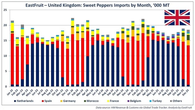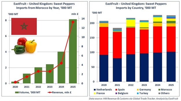 By the end of the year, Morocco's share of UK sweet pepper imports reached 3.6 per cent, compared to 1.7 per cent in 2024. The country moved ahead of France and approached Germany, ranking fourth among suppliers.