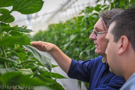 Richard Billekens shares his knowledge with a fellow grower who visits his greenhouse.