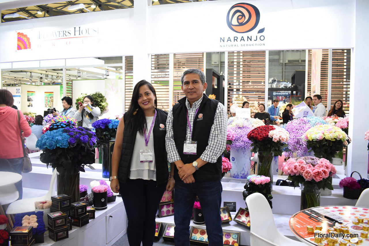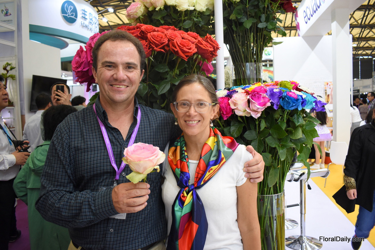 Guillermo and Mariana Bustamante of Sacha Rose presenting their painted and natural roses. They are one of the highest farms in Ecuador and are based at an altitude of 3,200 meters above sea level. This enables them to produce large head sizes and long stems. Their current main market is Russia, but according to Guillermo, this market is not always stable and the Chinese is growing. That's why they are exploring the Chinese market for several years now.