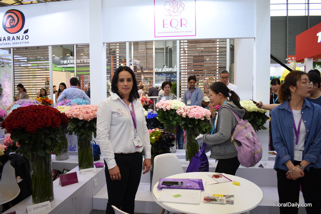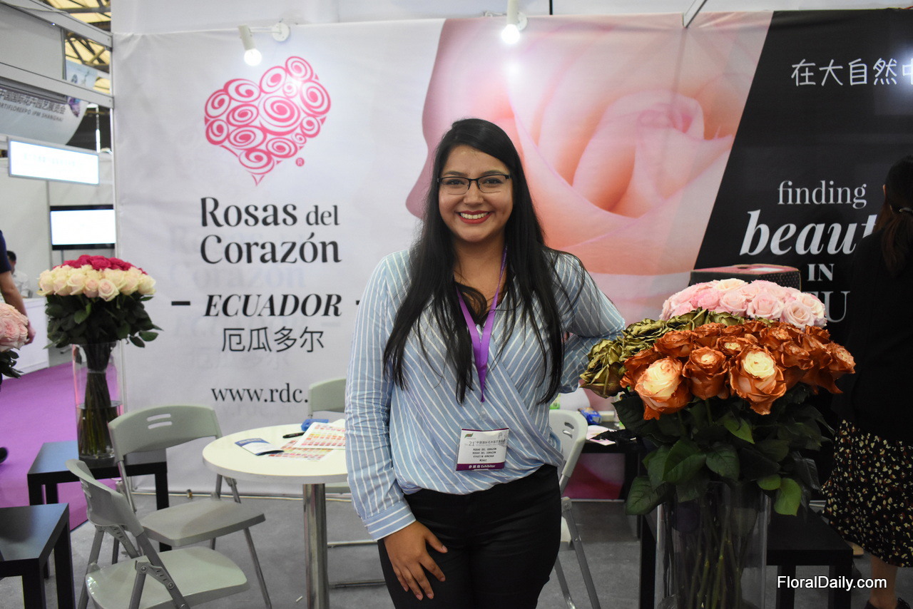 Paula Sanchez of Ponte Tresa. They are exhibiting in China for the first time. The grow roses in 3 farms in Ecuador and they are at the show to look for opportunities to export them to China. Currently, their main markets are the US and Switzerland.