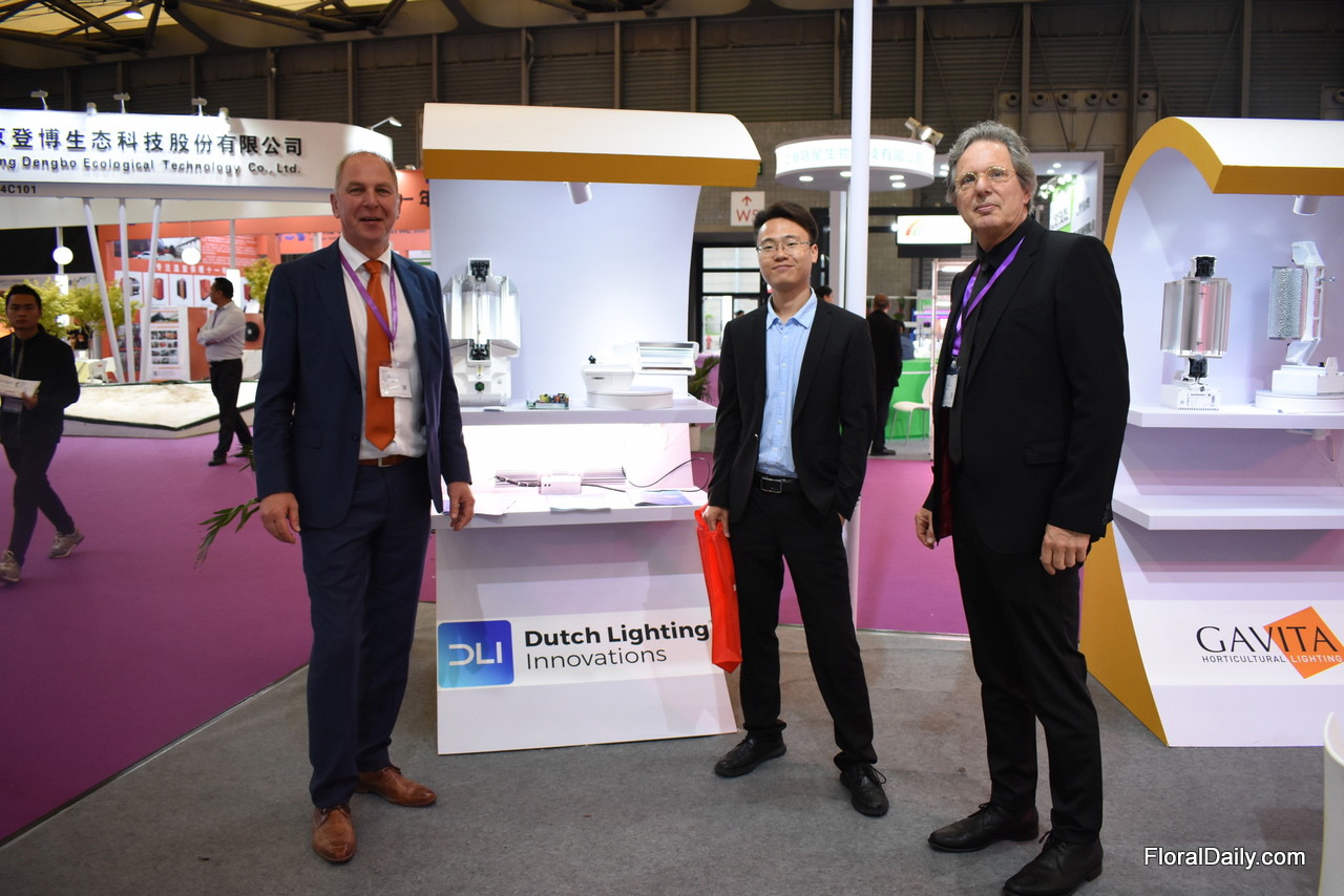 Ton ten Haaf of Dutch Lightning (left) and Paul van Raak (right) of P.L. Lightning Systems with a visitor of the show. They and more partners (P.L. Light Systems Gavita International b.v. Dutch Lighting Innovations LEDVANCE GSNL Agrolux) are represented in the booth Lightning Group. Together they are eager to develop the modern greenhouse industry for China.
