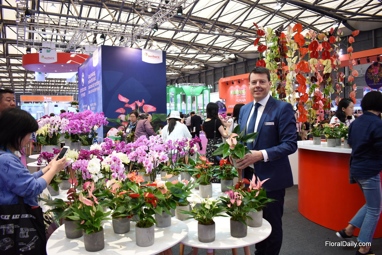 Sander Smeding of Anthura promoting the smaller sized anthurium and phalaenopsis. "For gifts, often a large plant with the typical colors - like a big red anthurium- are given. Now, the Chinese consumer needs to learn to buy plants for own use and then, we see a shift in demand towards the smaller products and in different colors. Also for the phalaenopsis, we try to introduce a 2 to 3 branched plant. Currently, the phalaenopsis market consists of cheaper 1- stemmed products. Arrangements are then made with more products."