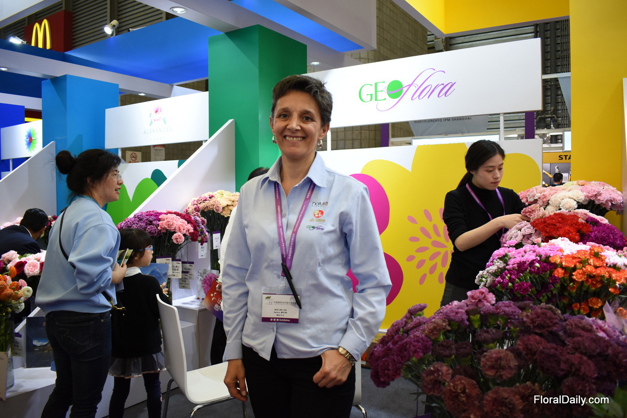 Sandra Medina of Geoflora started to export to China last year and is present at the Hortiflorexpo China for the first time. According to Medina, their new Pon Pon type and theur new Thrill series (new color, see the carnation on the right) attract a lot of attion.
