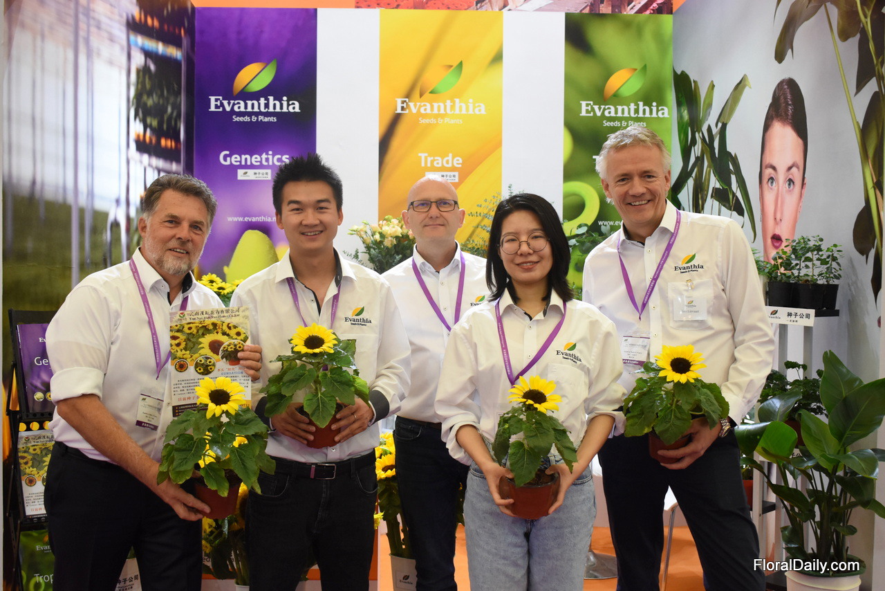 The team of Evanthia presenting the Sunsation, one of their varieties that is in high demand in China at the moment. "The Chinese are fond of sunflowers."