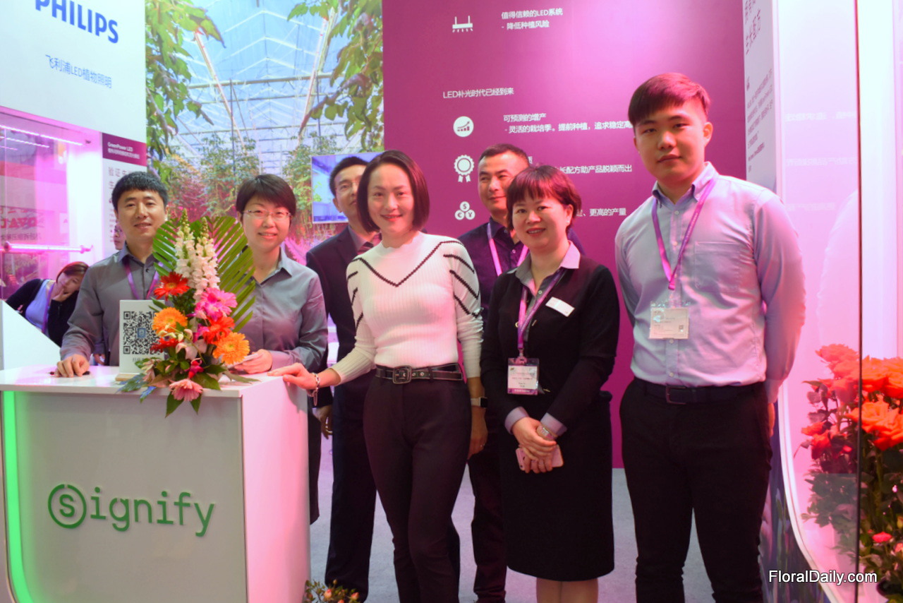 The team of Signify. Their sales are growing fast and there are proud of their good relationships with both the Dutch at the Wageningen University and their local partners. They conduct a lot of trials in China to see if the lights improve the quality and color of the plants. During the trials, they were pleased to see that their LED lights succeed. "Pure color is important for the Chinese consumer and we have seen that our LED's let the plants show a pure color."
